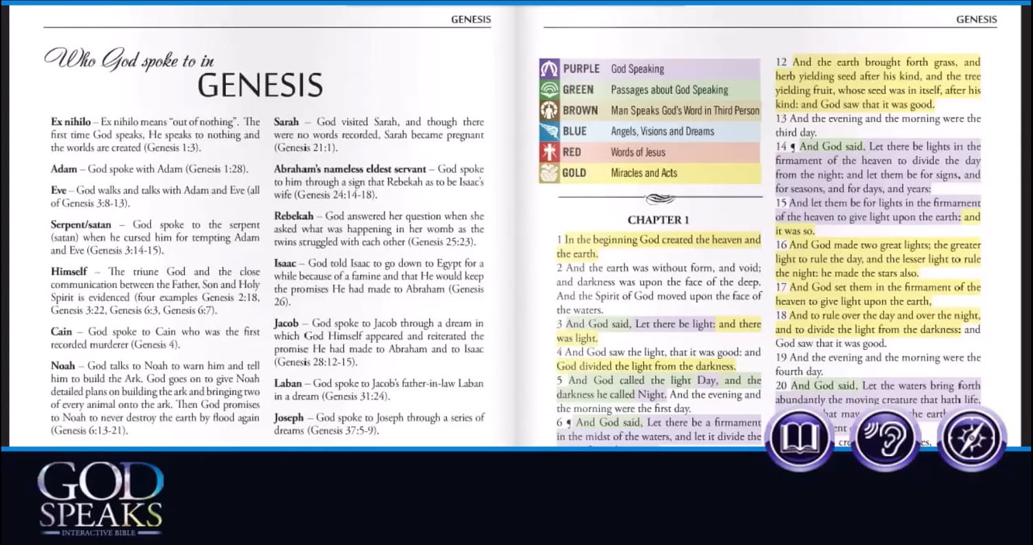The God Speaks Bible uses five colors to highlight all the unique ways God communicates, helping you learn to hear His voice. Your excitement will build as you witness God speaking to His people through angels, signs, wonders, miracles, the Holy Spirit, prophets, preachers, and many other ways.